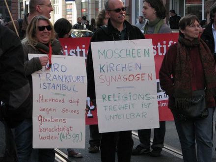 Ein dritter großer Sektor meiner Arbeit besteht in meiner Teilnahme an gesellschaftlichen und politischen Konflikten und Kämpfen, die es hierzulande gibt. Das ergibt sich ja schon aus dem, was ich ganz am Anfang zur Frage der Gleichheit gesagt habe. Für mich ist das keine Welt mit einem Eigenleben, die nichts mit meiner theologischen Arbeit oder meinem Religionsunterricht an einer Berufsschule zu tun hätte. Ich bin seit 2001 Sprecher eines antifaschistischen und antirassistischen Aktionsbündnis in Frankfurt, der Anti-Nazi-Koordination (
